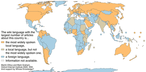Wikipedia’s local-language prevalence. Are the most detailed representations of a country written in a local language (orange and beige), or a foreign language (blue)? Language data: Unicode CLDR 2019). Licensed under CC NC-SA 4.0. Screenshot taken 12 August 2022.