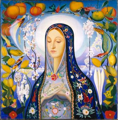 Modernist painter Joseph Stella drew on Southern Italian folk art and popular Virgin Mary shrines to produce this colorful 1926 painting. Fruits nimbus Mary’s head, vines climb up her arms, and a ring of flowers marks Mary’s womb, assuring the viewer that—across time and space—human beings continue to recognize the uncanny power of women’s bodies to manifest abundance.