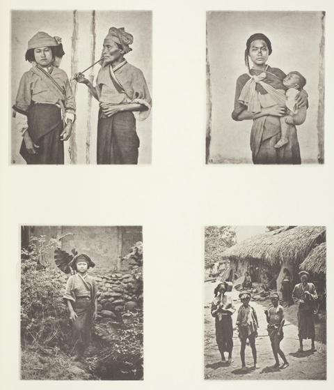Thomson’s documentation of Taiwan is a stark departure from the fanciful pre-photographic depictions of the region, and captures the landscape and Indigenous population with previously unused methods. In the series of six oval cameo portraits of Pepohoan (commonly referred to as the Pingpu or Plains Indigenous people) women and men, the subjects avoid looking directly at the lens and wear somber expressions. Portraiture photography with a plain background, where subjects are isolated from their environment, was commonly used to “objectively” document aboriginal people.22 The curated composition of the images on the page and the decision to include side profiles made in an ethnographic manner are of course subjective, conceived with a colonial mindset not far from that of Valentijn. While some have praised Thomson’s photographs for “showing a rare sensitivity” compared to his peers, his work still transmits the colonial gaze.23
