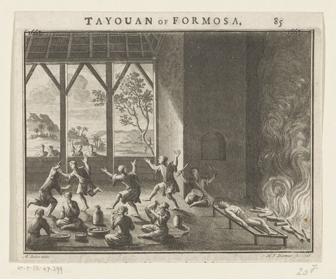 This engraving depicting an unspecified Indigenous funerary ritual is the only visual representation of Taiwanese people in Oud en nieuw Oost-Indië. The section title at the top of the image, “Tayouan of Formosa,” refers to the multiple names of Taiwan. “Tayouan” derives from the ethnonym of an unidentified Indigenous group and was frequently applied to the area of the VOC commercial post.14 The name “Formosa” dates to the 16th century when Portuguese navigators called Taiwan “Ilha Formosa” (Beautiful Island), a title that Europeans adopted.15