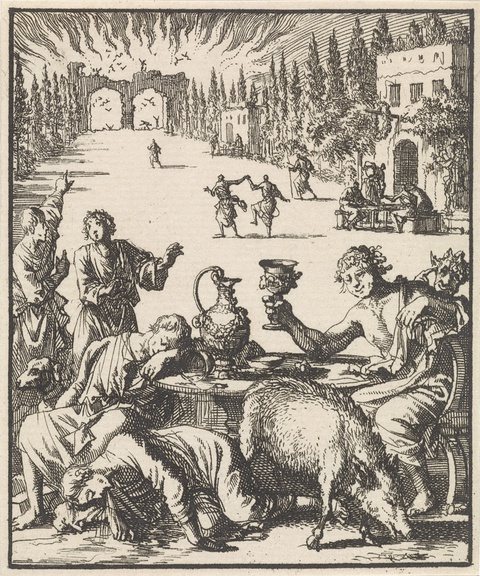 While Christian charity may have provided much-needed aid to poorer members of society, it was only a superficial and temporary remedy to issues caused by extreme, systemic inequality. Those who took more than their fair share—whether of food or money—not only risked being depicted unfavorably in artworks but were also, in some views, deemed worthy of eternal punishment. In a work titled Drunkenness and Gluttony Lead to Hell, artist Jan Luyken presents three drunk men seated at a table. A pig roots for scraps, a devil hovers behind one man’s back, and the gates of hell burn brightly in the background.