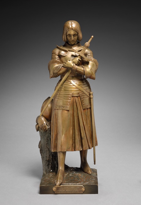 An 18th-century sculpture by Marie-Christine d’Orleans, a princess of France, depicts Joan as a pious leader. Her body leans androgynous. She has cropped hair, which in medieval Europe indicated humility or defeat. Her sexuality takes a backseat to her piety as she prayerfully clasps her sword.