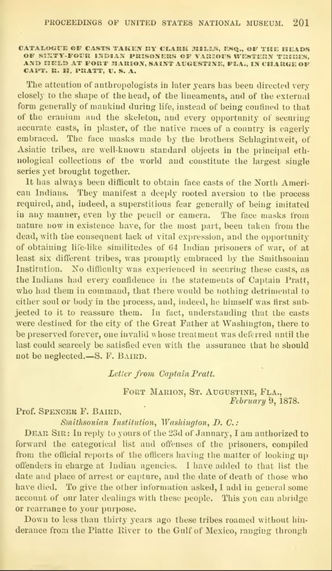 Pratt, R. H., Catalogue of casts taken by Clark Mills, Esq., of the heads of sixty-four Indian prisoners of various western tribes, and held at Fort Marion, Saint Augustine, Fla., in charge of Capt. R. H. Pratt, U. S. A. Proceedings of the United States National Museum, 1878, 1(29): 201-214. Smithsonian Libraries. This is the first of 14 pages.