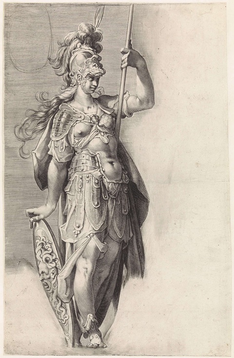 In contrast, this 16th-century Dutch engraving of Minerva characterizes the goddess as feminine, even coquettish. Like the “boob armor” worn by today’s women superheroes, her armor offers little to no protection. Instead, it plays up her breasts, contrasting the protective metal with her vulnerable, exposed body.