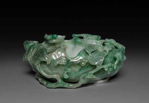 Brushwashers served the practical purpose of removing excess ink from brushes and cleaning them after use. But they were also symbolic. The artisan carved this jade example, below, in the form of a lotus leaf, a common shape for scholarly implements.38 The gleaming, green and white jade has the juicy luster of fresh leaves.