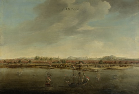 A 17th-century painting of Canton, now Guangzhou, shows the bustling port where the VOC’s ships docked to trade tea, silk, and porcelain, as well as traffic enslaved people. The work was part of a series of paintings shown at the VOC headquarters in Amsterdam in the 17th and 18th centuries. The painting was exhibited alongside views of Cochin (now Kochi) on the Malabar coast and Judea (now Ayutthaya) in present-day Thailand—a display that sought to underscore the company’s global reach.2
