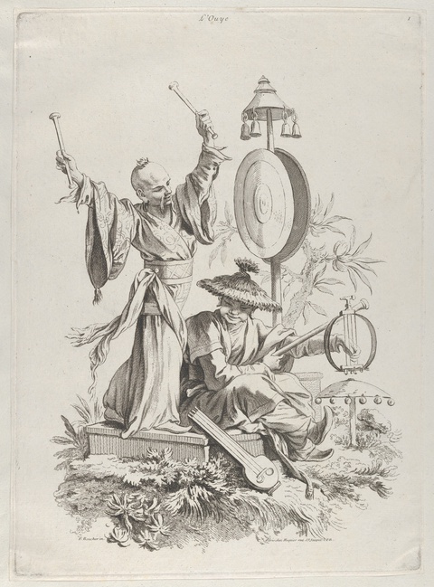 François Boucher, premier painter to Louis XV, also played a key role in France by popularizing chinoiserie print suites.12 An avid collector himself of East Asian objects (as per his posthumous inventory), Boucher designed rococo scenes of “Chinese” doctors, botanists, and musicians that were disseminated as print suites that could be adapted into paintings, tapestries, and porcelain for elite consumers, with these goods becoming markers of cosmopolitanism.
