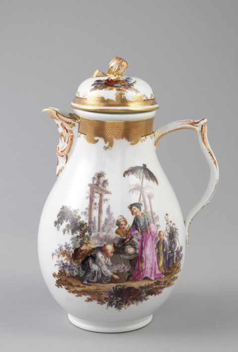 A coffee pot made by the Royal Porcelain Factory in Berlin featuring a scene after Boucher makes artisanal networks of chinoiserie visible. French manufactories produced imitation, or soft-paste, porcelain until Meissen in Germany perfected true hard-paste porcelain in 1710.13 During this period of technical evolution, European artisans had looked directly to East Asian export wares—Chinese Dehua and Kraak and Japanese Kakiemon and Imari—for visual inspiration. With the ready circulation of ornament prints by European artists, however, those images increasingly supplanted direct Asian prototypes. Highly stylized, deliberately “unnatural” chinoiserie motifs came to dominate 18th-century decorative arts, migrating across materials and workshops.14