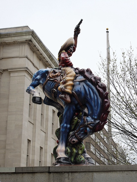 Greyloch, Photo of Luis Jiménez’s Vaquero, 2012. Flickr, CC BY-SA 2.0. Luis Jiménez’s sculpture of a vaquero shooting a gun atop a bucking horse adorns Washington DC’s Smithsonian Institute.