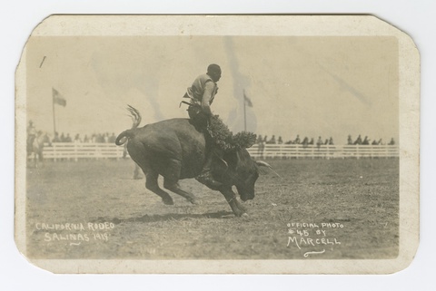 Postcards also showed Black cowboys in action. One postcard shows a Black contestant riding a bull at the California Rodeo. The Salinas event included some Black riders in the 1910s, when this photograph was taken.20 Black riders also formed their own rodeos, since many shows excluded riders of color.21