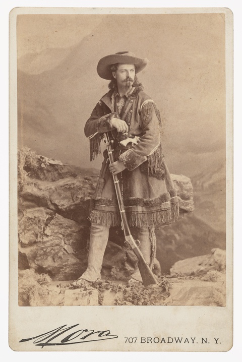 New York-based photographer José María Mora shot a studio portrait of Buffalo Bill in 1875. The showman wears a long fringed coat and cowboy hat and leans against a rifle. Yet this, too, is a costume: Bill is silhouetted not by distant mountains but by a set in New York City.