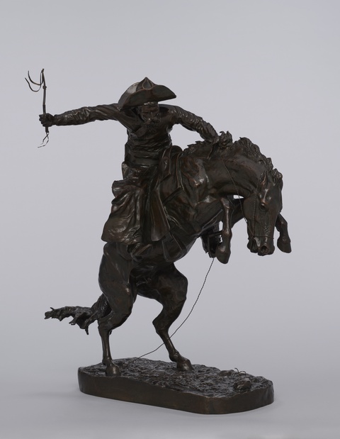 This is the action of Frederic Remington’s 1895 sculpture The Bronco Buster. Remington was a New York-born artist who became famous for paintings and sculptures idealizing the so-called Wild West. The Bronco Buster exemplified many mainstream depictions of the American frontier. It shows a ruggedly masculine, white cowhand dominating nature, here represented by a feral horse.