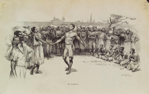 E. W. Kemble, The Bamboula, 1886. The New York Public Library, public domain. Drummers provide a rhythm for the Bamboula.