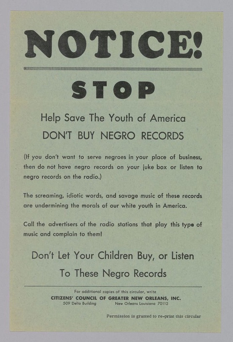 This characterization of the nature of Black music as evil and unpolished increased in the high-tension environment of the Civil Rights era. Throughout the 1960s and 70s, handbills like the one pictured from the Citizens Council of Greater New Orleans called for white people to strike against Black records. This poster rabidly proclaims: “The screaming, idiotic words, and savage music of these records are undermining the morals of white youth.” These calls-to-action were indicative of the ways in which white America blamed Black music and musicians for ruining America’s social makeup.9