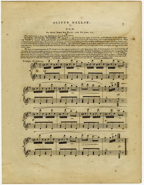 Horace Waters, Tom, The Blind Negro Boy Pianist, Only 10 Years Old, 1860s. Engraved sheet music, 5 pages. This is the second page. The front cover's title reads "TOM / The Blind Negro Boy Pianist / Only 10 Years Old"