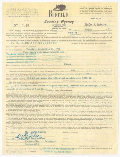 Contract for B.B. King and Orchestra, Buffalo Booking Agency, contract dated August 18, 1955.