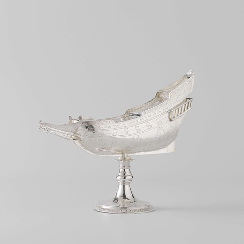 One such costly item is this silver spice box from the Dutch city of Middelburg, an important VOC port.8 It would have held luxurious spices such as nutmeg and cinnamon. The box celebrates colonial wealth both in its design and materials. It is a model of the Mauritius, a Dutch ship that traveled to Indonesia in an early trade expedition.