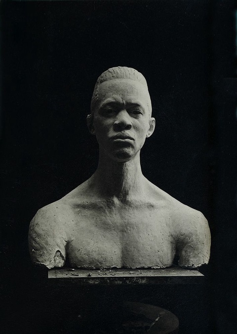 She was determined to exorcize the racism and oppression she experienced in the United States as she forged this new path in Paris. In her journal, Prophet wrote, “As soon as I could stand up, I went to work, sick, but with a dogged determination to conquer.” She was fortified “with a calm assurance and savage pleasure of revenge.”8 The first work Prophet made in Paris was an untitled clay bust believed to be a likeness of her husband.7 She labored over the piece for a month. Her subject’s eyes are downturned beneath a faintly furrowed brow that reads as calm and resolute; the artist would repeat these contemplative, meditative facial details in future works. A version of the same bust in wood, titled Negro Head, was exhibited at the Salon d'Automne, Sociéte des Artistes Français, in Paris in 1924.