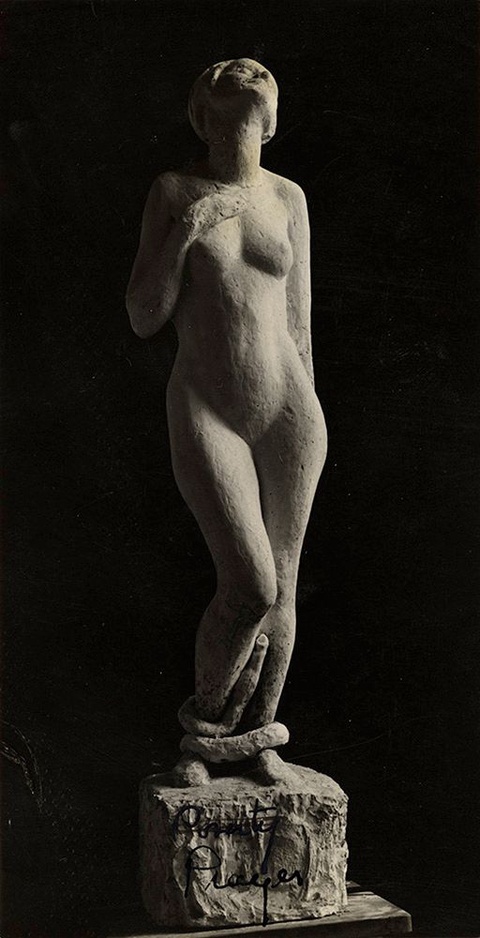 The subject is a bare-breasted woman in contrapposto with her head tilted back. A snakelike form binds her ankles and feet, possibly representing the artist’s state of mind. The figure ascends from a craggy, rough hewn base, another convention Prophet returned to in other works. The base offers a textural contrast and makes her subject appear to emerge from the treacherous elements of the natural world. The dichotomy between the constriction of the figure’s legs and her skyward gaze is mirrored in the evolution of the piece’s title. Prophet renamed the piece Prayer.