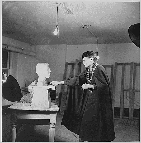 Kenneth Space, Elizabeth Prophet, sculptress and teacher, 1936-1937. National Archives Catalog, unrestricted. Photograph of Nancy Prophet in her studio working on a clay bust of a man.