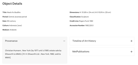 As Sasson wrote, there is no mention of the head being cut from its body, or how it came to be owned by Christian Humann of New York, a French-born collector of South and Southeast Asian art active from 1960–1980. While provenance is often murky, it would not be a stretch to indicate that this head once had a body. We may not know who did the cutting and under what circumstances, or who packed and shipped or carried the head from Indonesia to New York, but the severing is as much a fact as Humann’s ownership, or the trail of exchanges that landed it in the Met.