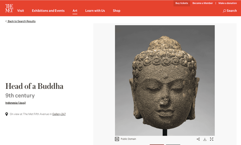 The similarity between this screenshot and the one from the Smithsonian’s search results underscores the leveling effect of digitization. While the experience of walking into a museum is usually very different from that of walking into a store, the experience of searching for and viewing artifacts on a museum website really isn’t that distinct from the experience of online shopping. Here, the Buddha’s head is reproduced as an item of home decor, meant to signal spirituality and serenity. This recycling highlights not only the commodification of spiritual traditions but also the degree to which Western audiences have uncritically accepted the decapitation of sacred sculptures from other cultures. As detailed in this blog post from Anonymous Swiss Collector, we not only see the severing as normal, but have appropriated the heads as kitschy symbols of “pseudo spiritual artsy refinement,” when they are actually evidence of violence and desecration.