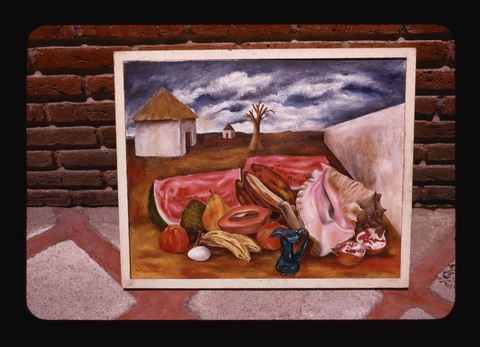 Florence Arquin, Photograph of María Izquierdo’s “Naturaleza Viva,” undated. The Arquin Slide Collection, copyright undetermined. Arquin, an American photographer who frequented Mexican cultural circles, documented several of Izquierdo’s paintings, including this still life (or as Izquierdo called it, “living nature”) of ripe fruit piled in a desolate landscape.