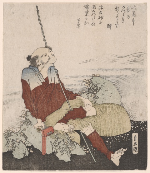 Like many historical women artists, who often worked under more famous male relatives, it is difficult for contemporary art historians to identify which elements or works of Hokusai’s are actually in Ōi’s hand.9 However, art historians have identified some joint works. Ōi collaborated with Hokusai on his Self-Portrait as a Fisherman. It is part of a genre called surimono, designating works printed for private special occasions that include both an image and a poem.